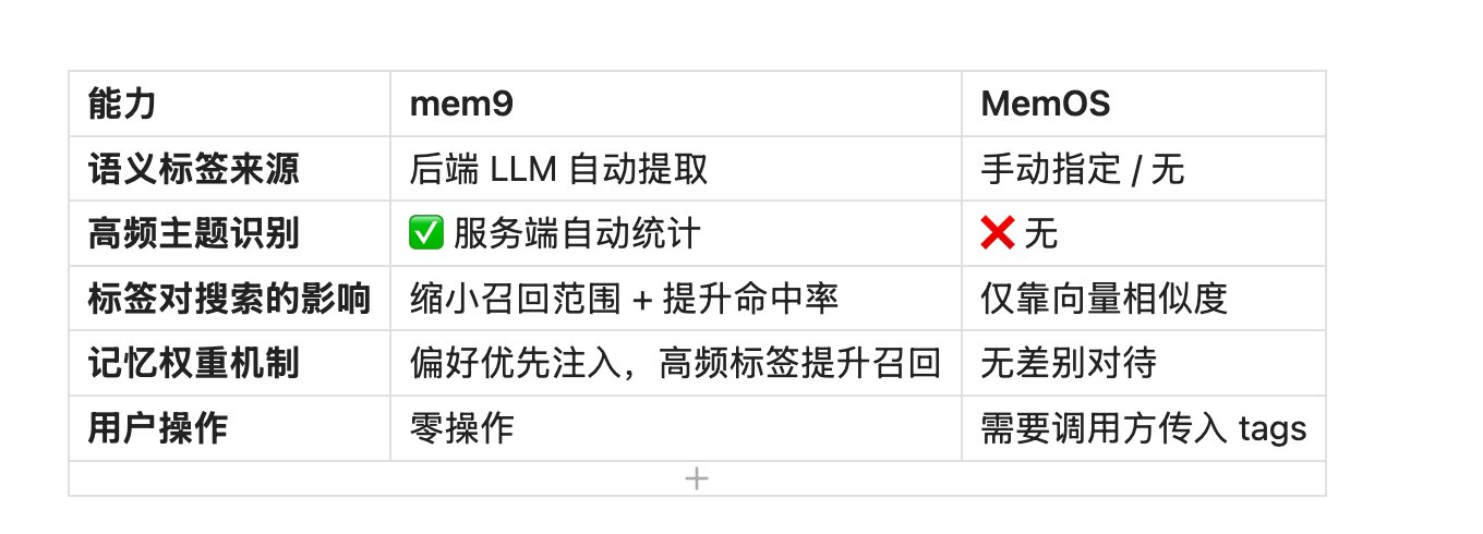 • 标签和分类信息附着在每条记忆上,成为搜索时的额外维度